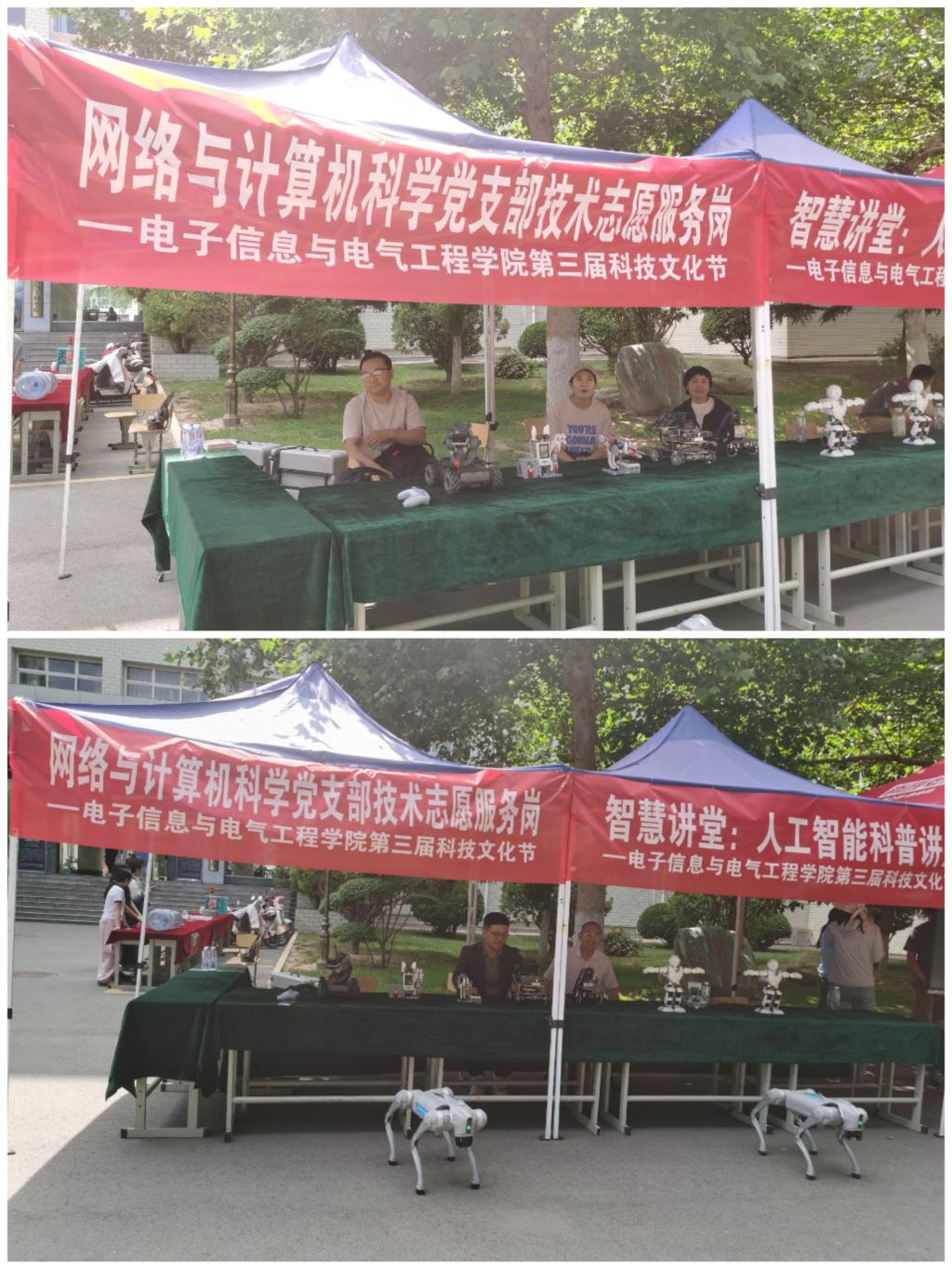 在点亮红色记忆的同时,支部党员们不忘服务师生的初心使命。活动期间,支部在科技文化节主会场显著位置设立了 “网络与计算机科学党支部技术志愿服务岗”。支部党员教师积极响应号召,主动报名,轮流值班,为全校师生提供专业、便捷的计算机相关技术咨询与问题解决服务。服务岗前人头攒动,络绎不绝。师生们带着笔记本电脑、手机等设备前来咨询的问题涵盖了日常使用的方方面面:从软件安装调试、系统故障排除、网络连接优化,到学习办公软件使用技巧、数据恢复、信息安全防护建议等。党员教师们凭借扎实的专业知识和丰富的实践经验,耐心细致地为每一位前来求助的师生答疑解惑,现场解决了许多困扰师生的“小麻烦”,对于无法现场解决的复杂问题,也提供了清晰的解决路径和专业建议。“没想到在科技节上还能享受到这么贴心的‘义诊’服务,老师们的技术真过硬,解决了我电脑卡顿的老大难问题!”一位前来咨询的学生满意地说。另一位老师则表示:“党员志愿服务岗设得好!既体现了专业特色,又真正服务了大家,效率高、态度好,必须点赞!”
